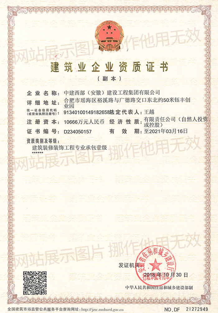 2018年10月,开云官方网页版顺利地通过了开云(中国)企业资质的审查,是公司继开云(中国)施工总承包壹级、市政公用工程施工总承包叁级资质之后,取得了建筑装修装饰工程专业承包壹级资质。