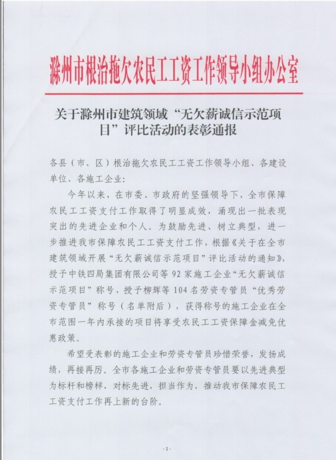 近日,喜报连连,开云官方网页版集团承建滁州奥特莱斯仪邦项目获评滁州市建筑领域“无欠薪诚信示范项目”。滁州市根治拖欠农民工工资工作领导小组办公室印发《关于滁州市建筑领域“无欠薪诚信示范项目”评比活动的表彰通报》,对我司获评进行了表彰通报。