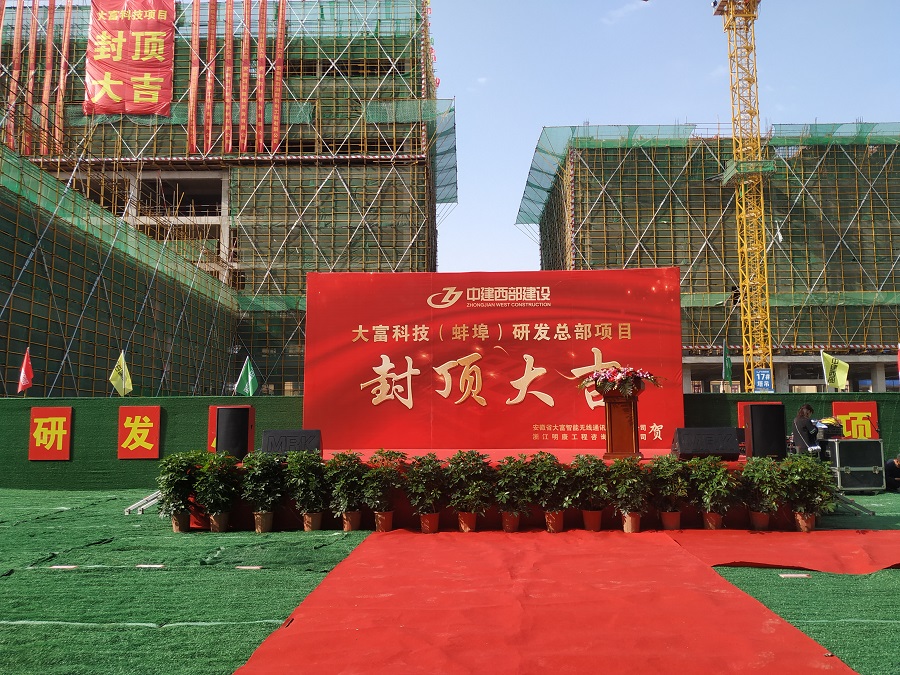 活动现场,礼花鞭炮齐鸣,主持人以热情洋溢的声音宣布大富科技(蚌埠)研发总部项目喜结金顶。大富科技研发总部项目部负责人周吉海先生致辞,向前来参加封顶仪式的各位领导、各位来宾致以美好的祝福和热烈的欢迎,同时向奋战在第一线的全体职工表示崇高的敬意。出席嘉宾在主席台宣布完成封顶混泥土浇灌,使之活动现场气氛达到高潮。大富科技(蚌埠)研发总部项目封顶仪式也伴随着大家的欢呼声圆满结束。