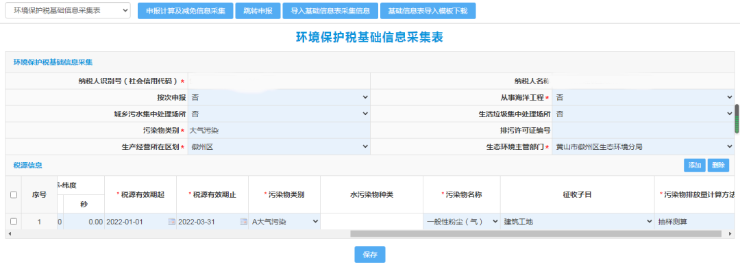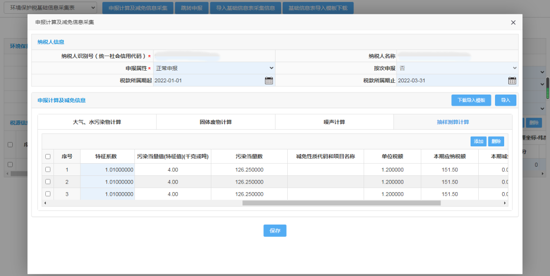 依次输入带“*”的必填项,注意排放口编号自拟,污染物名称选择“一般性粉尘(气)”,征收子目选择“建筑工地”、“市政、拆迁、道桥”,污染物排放量计算方法选择“抽样测算”,点击保存,进入申报计算及减免信息采集界面。