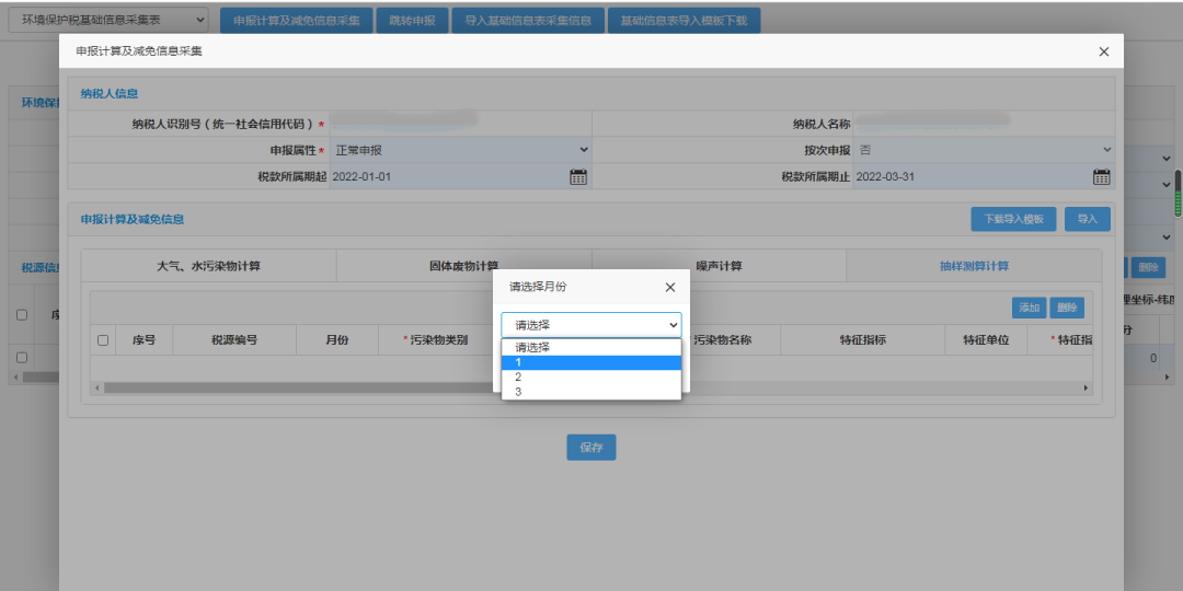 添加申报季度内全部月份数据后,输入“特征指标数量”即月建筑面积和“特征系数”(特征系数默认为扬尘产生系数1.01,可自行修改),自动计算应纳税额,点击保存。