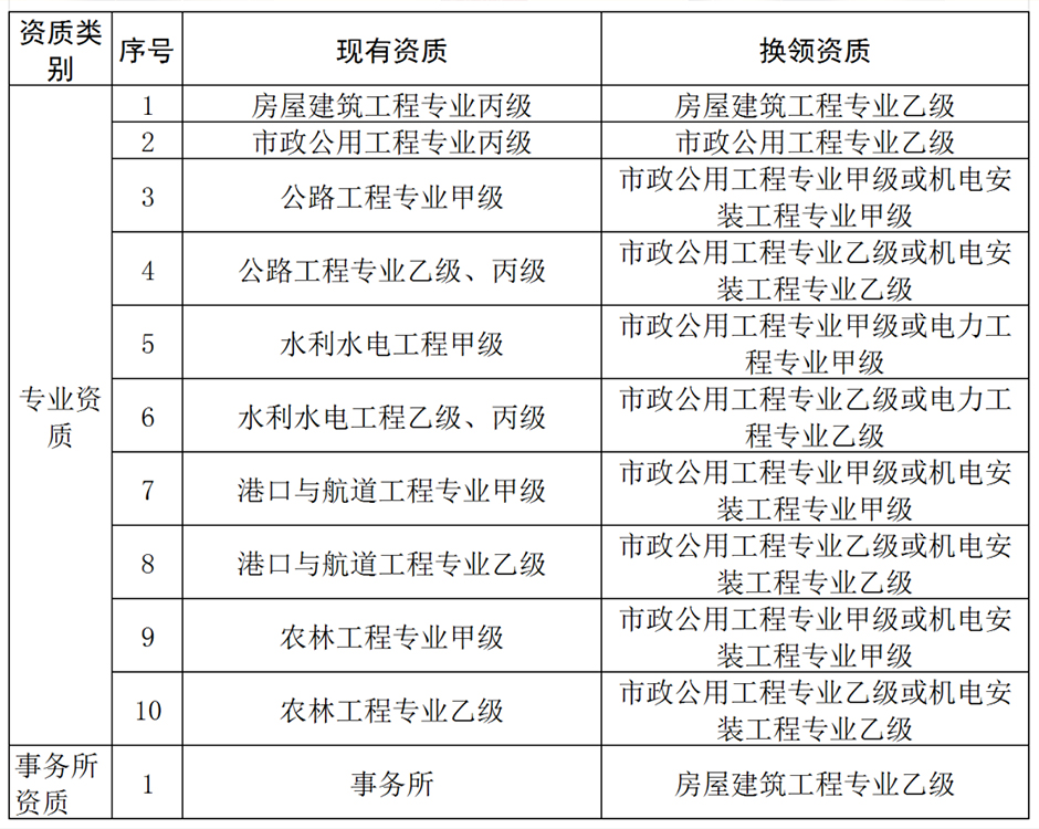 一、《国务院关于深化“证照分离”改革进一步激发市场主体发展活力的通知》(国发〔2021〕7号)决定取消的建设工程企业资质,企业可在资质证书有效期届满前换领有效期1年的相应专业资质证书。工程勘察设计丙级、丁级资质换领相同专业乙级资质证书,施工总承包、专业承包三级资质换领相同专业二级资质证书,有关工程监理企业资质按《已取消的工程监理企业资质证书换领对照表》(见附件)换领相应专业等级资质证书。资质证书有效期届满前未申请换领相应资质证书的,逾期自动作废。取得有效期1年资质证书后,企业应在该资质证书有效期届满前,按有关资质管理规定和资质标准申请延续。