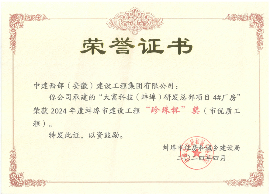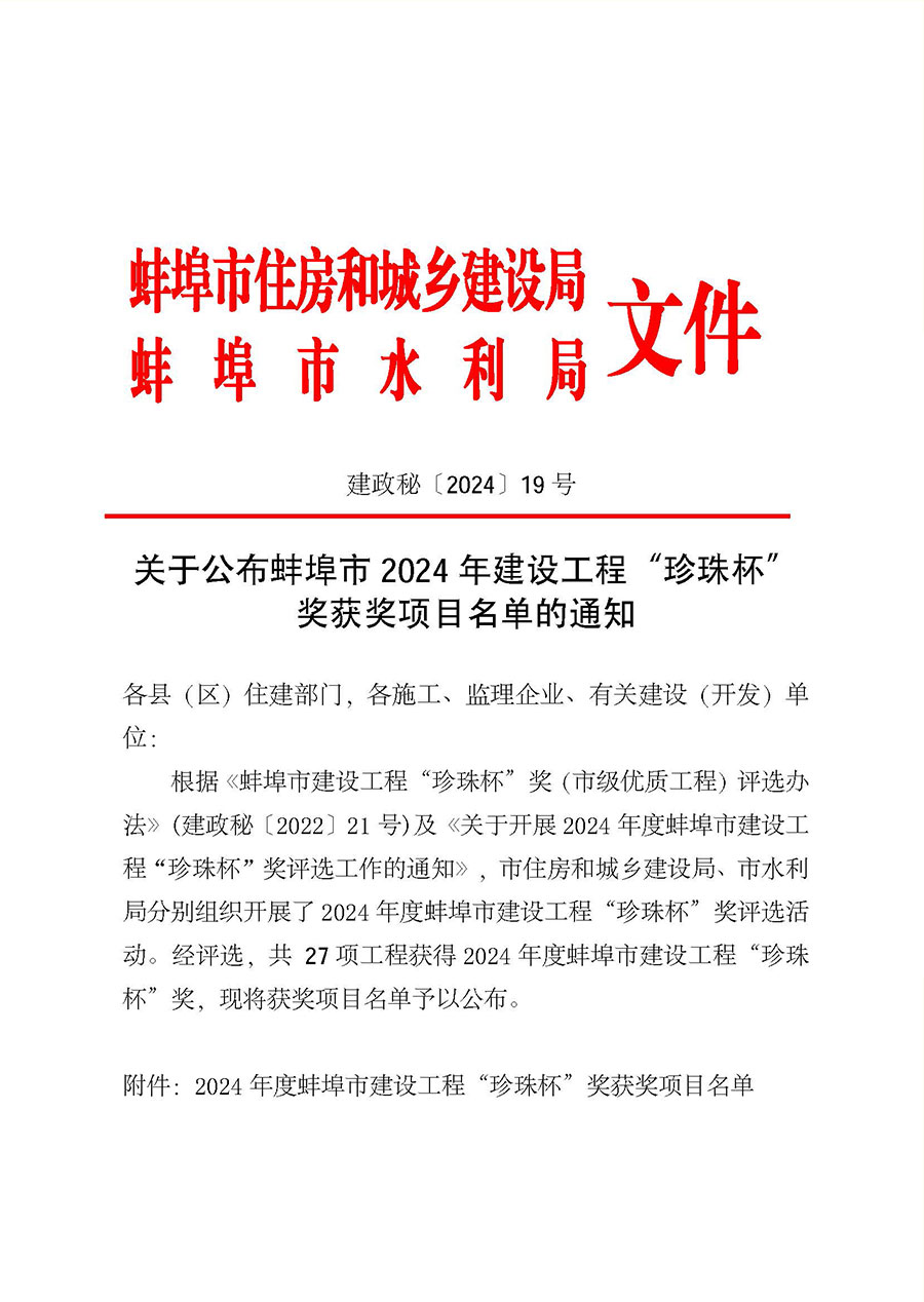 热烈祝贺开云官方网页版(安徽)建设集团荣获蚌埠市建设工程“珍珠杯”奖